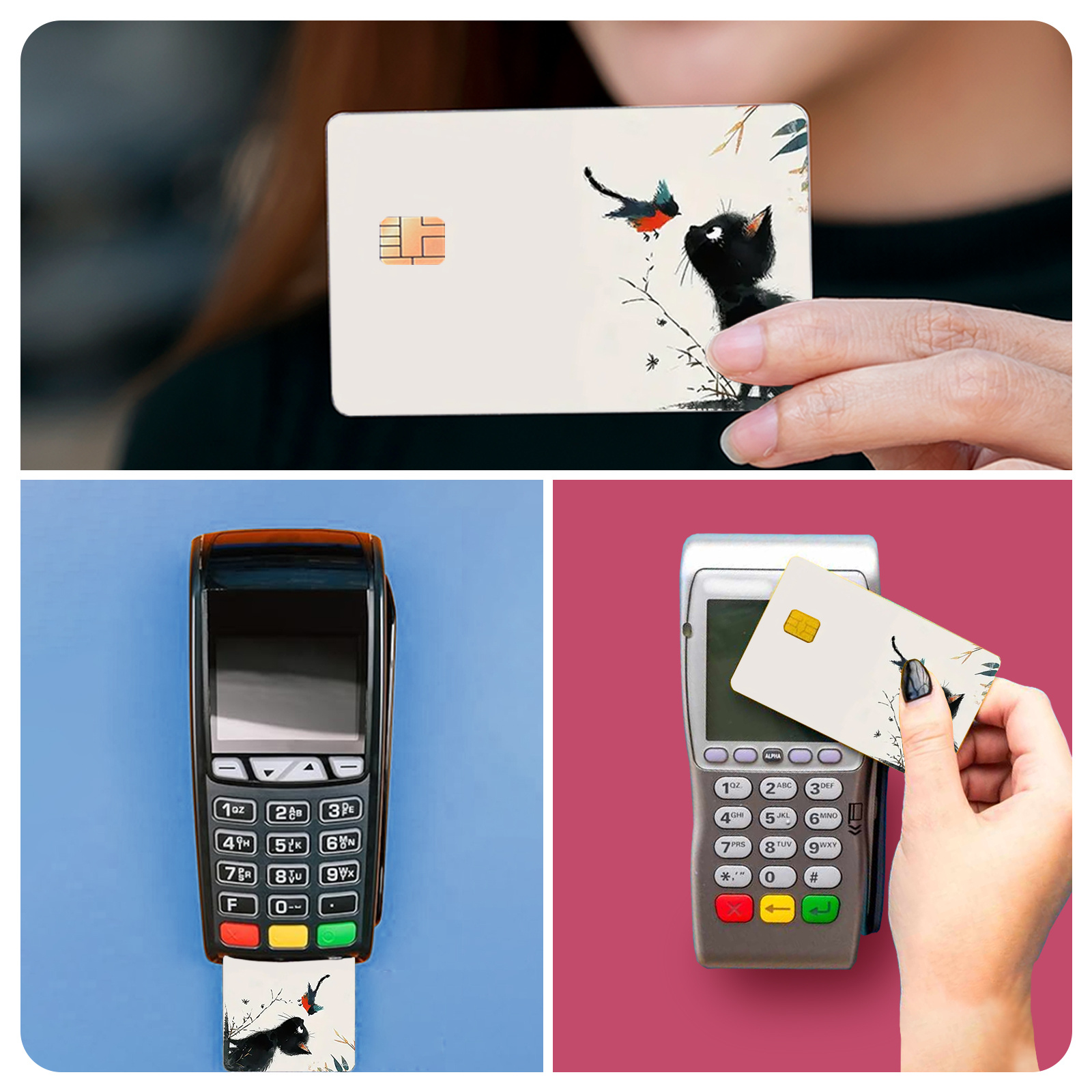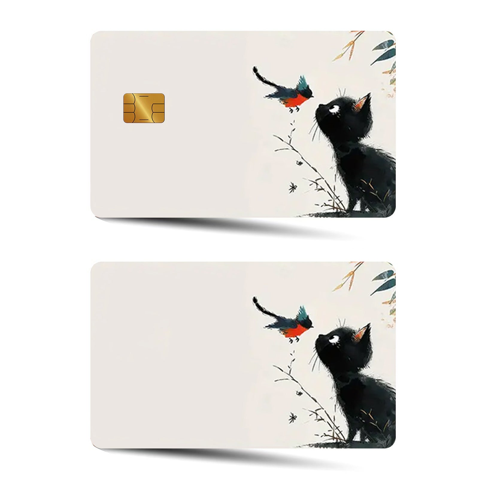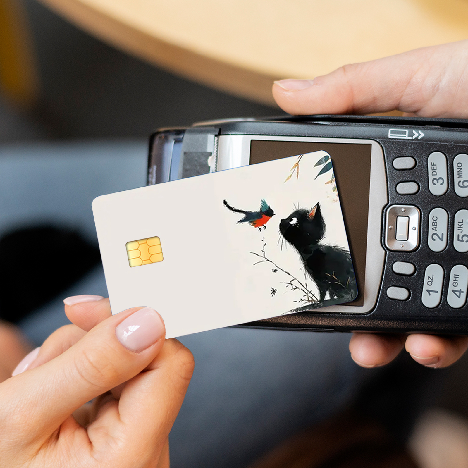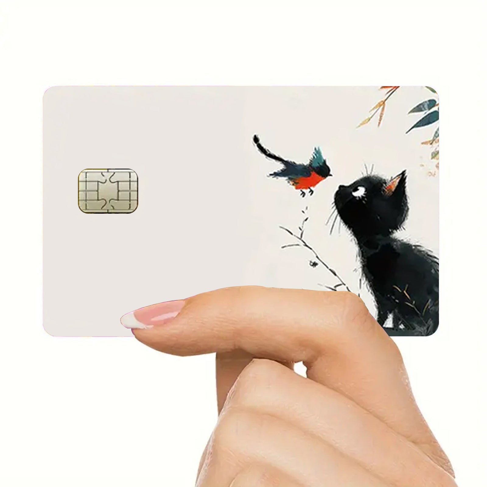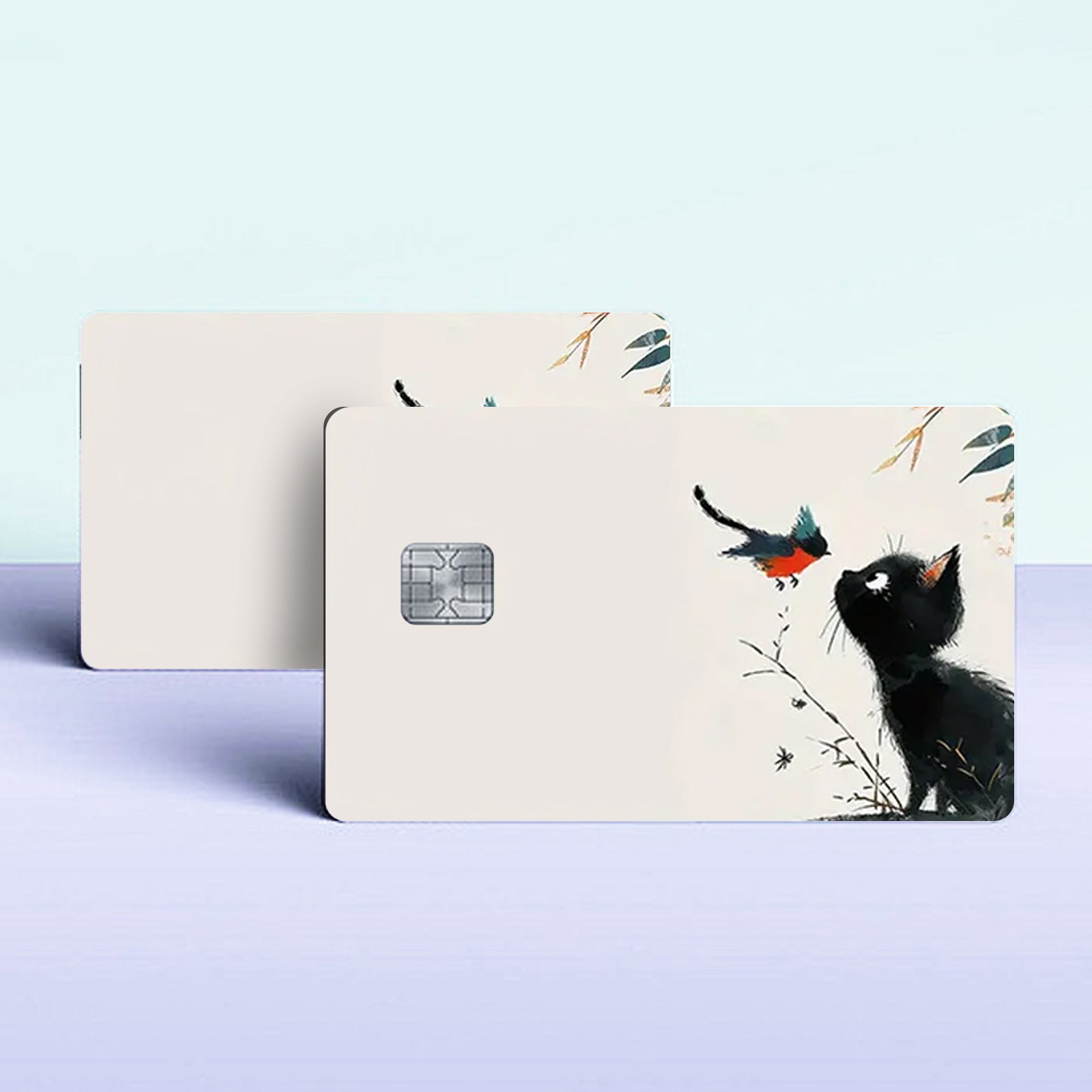 Елегантна артистична сцена, в която деликатната връзка между котка и птичка оживява в хармония на форми и цветове. Този дизайн носи усещане за тишина и финес, придавайки стил и характер на вашата карта.